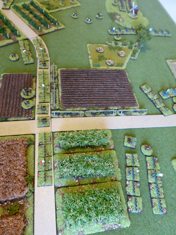 The Red unit in the ploughed field in danger of being cut off or turning the Blue flank; only time will tell which it is.