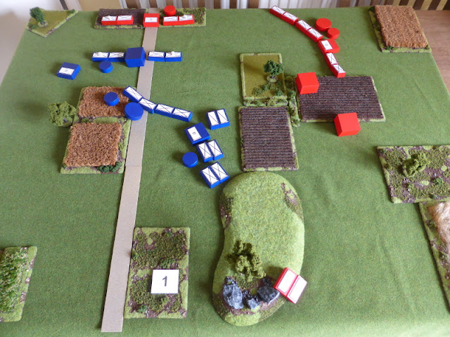 With orders received, I set about deploying both sides as can be seen below. I used my wooden blocks for the game and not only do I find them fun to play with, but they make the action a lot easier to follow, due to my limited photography skills and if using my Commission Figurines figures.