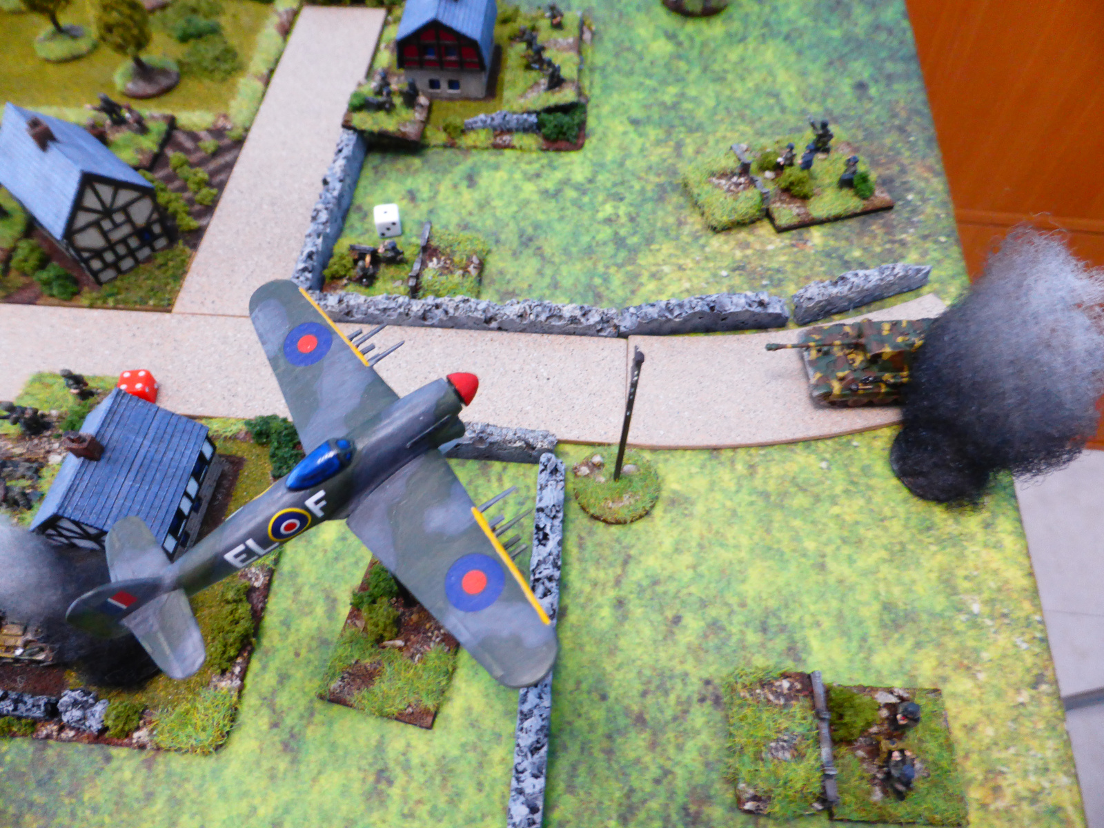 | At the start of Turn 5 the RAF arrive and easily KO the Panther, much to the relief of the Churchill tank crews. |